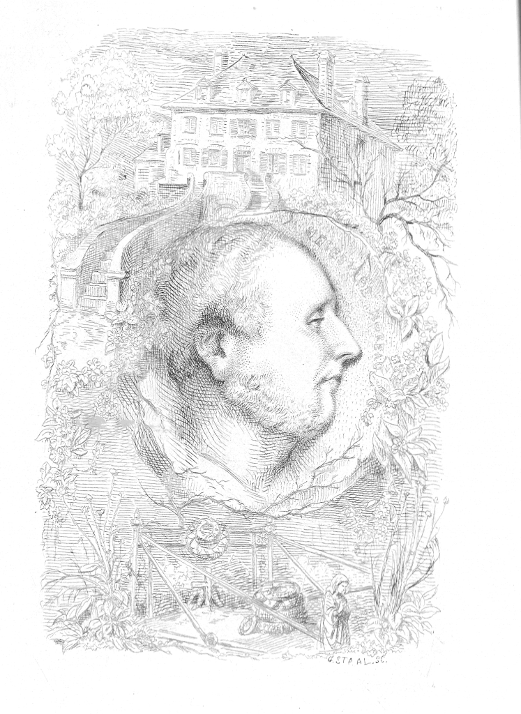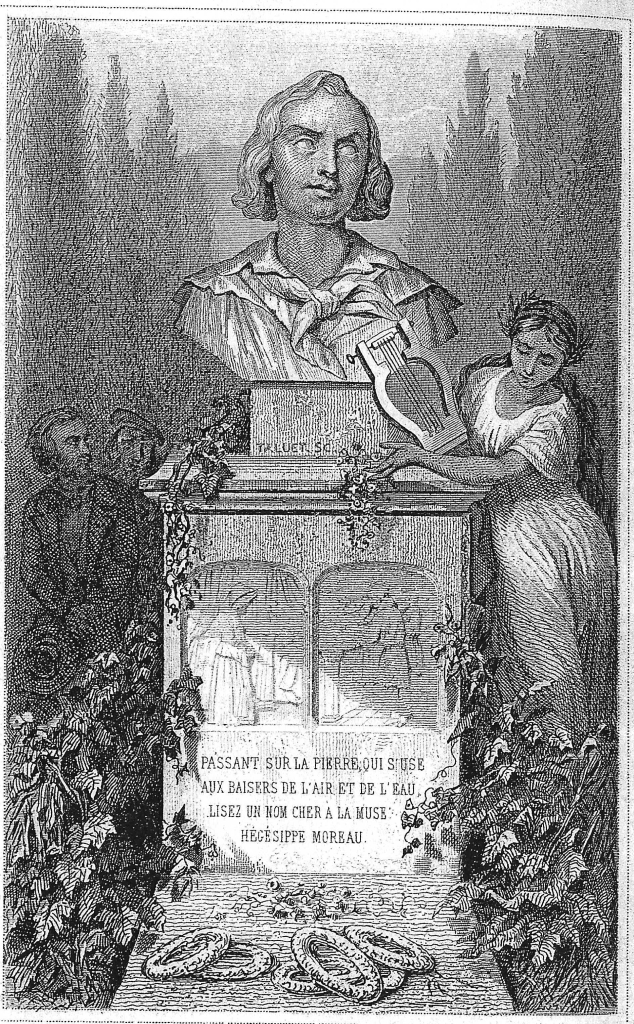J’ai extrait ce portrait de la gravure à l’eau forte de G. Staal qui se trouve en frontispice de Hégésippe Moreau, sa vie et ses œuvres de Armand Lebailly qui le présente comme réalisé par le graveur d’après le masque mortuaire de Hégésippe Moreau. |