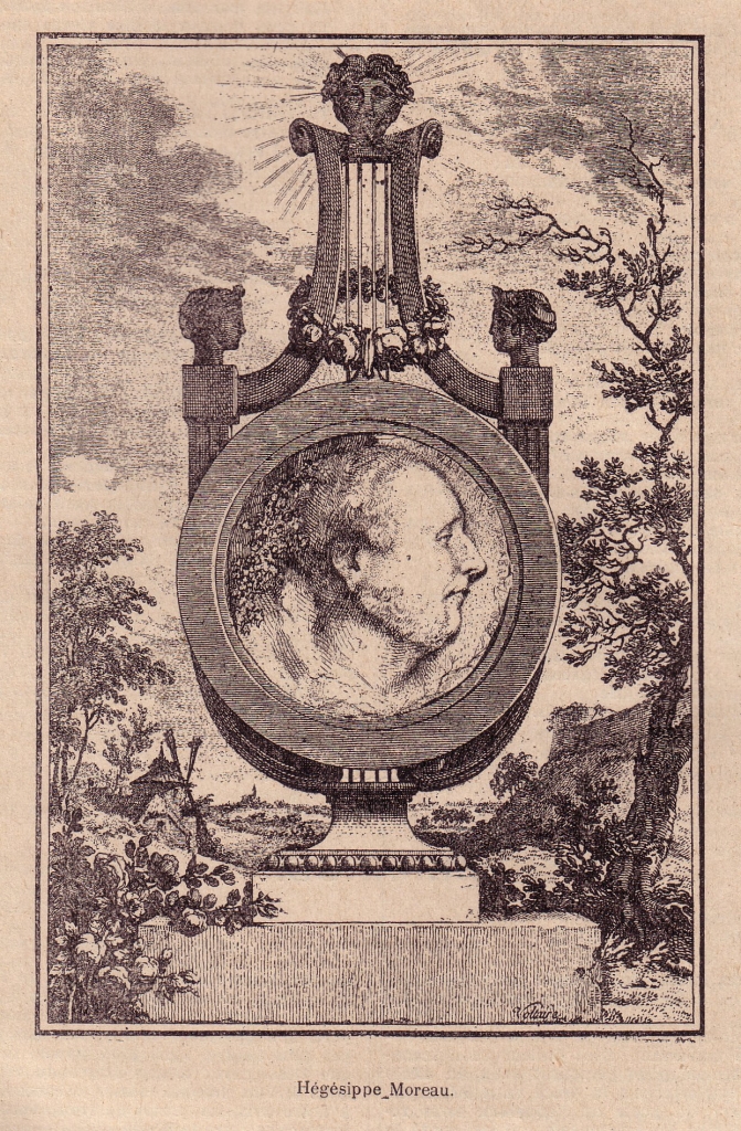 Ce portrait provient de la page intitulée Les auteurs du Charivari sur le site du « Centre d’études du xixe siècle français Joseph Sablé », Université de Toronto, Ontario, Canada. Contrairement à ce qu’annonce ce site, Hégésippe Moreau n’a, bien entendu, jamais fondé la Némésis. Voir en coulisse pour quelques remarques. Il fait face à la page de garde de l’édition des œuvres complètes préparée par René Vallery-Radot et publiée par Alphonse Lemerre en 1890. |